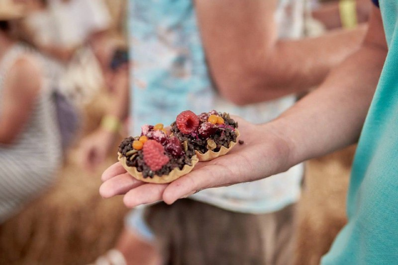 ⁃ корзинку из черной органической чечевицы, запаренной на квасе, с клюквой, косточкой дикого абрикоса и соусом из арбузного меда (нардек);
